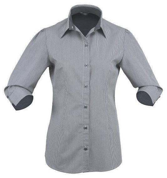 Feature Women's 3/4 Sleeve Tonal Check Shirt Career Contemporary Fit Placket Front Classic Collar Action...