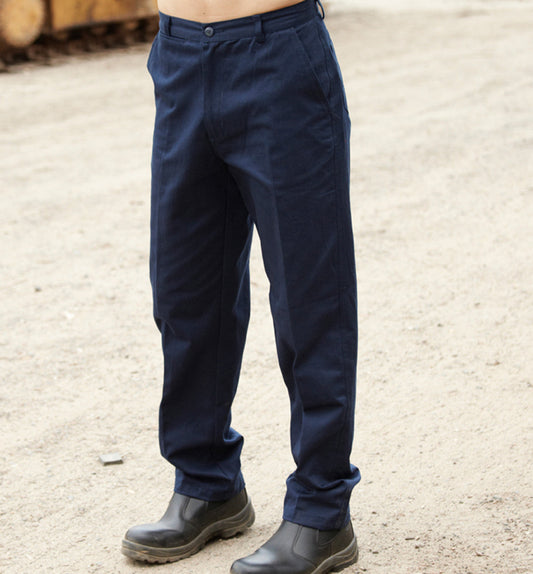 Heavy weight 311gsm cotton drill, pleat front. Heavy duty nylon zip .