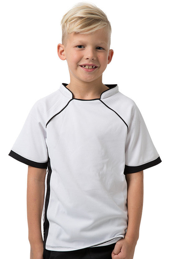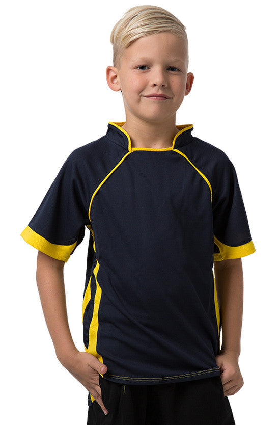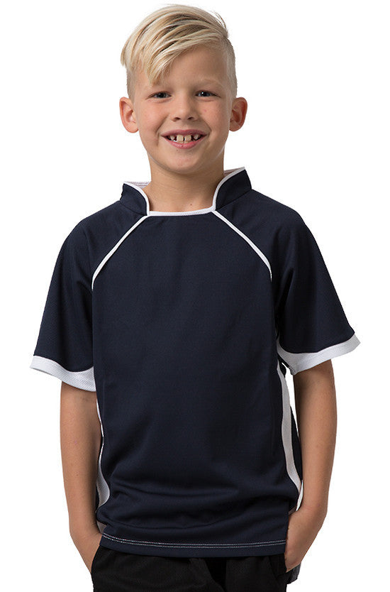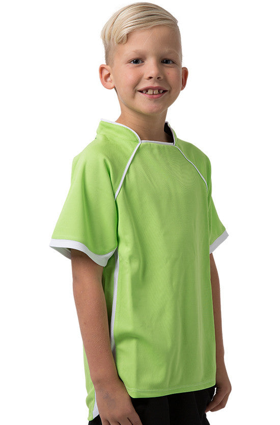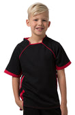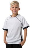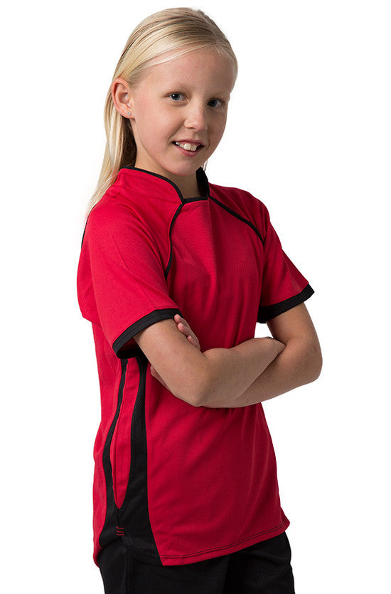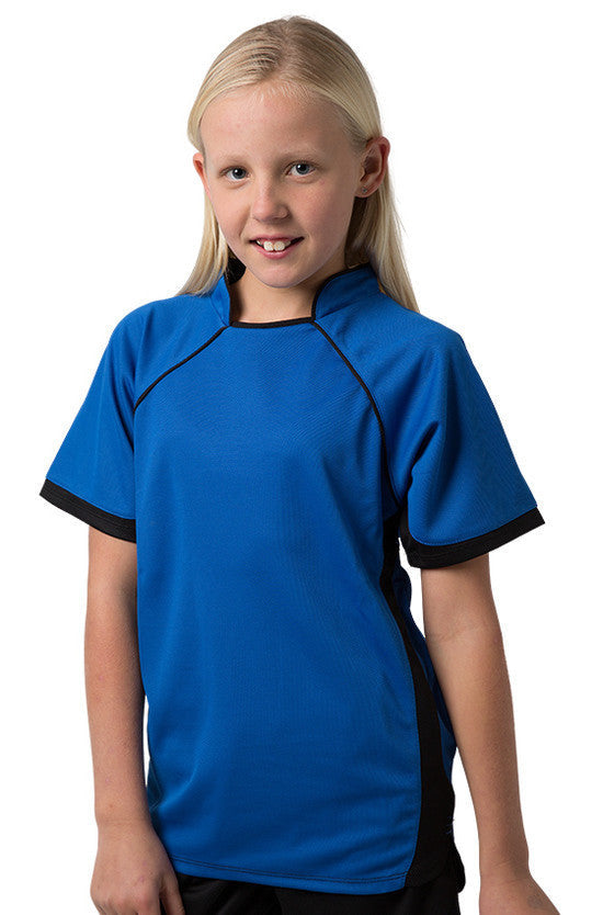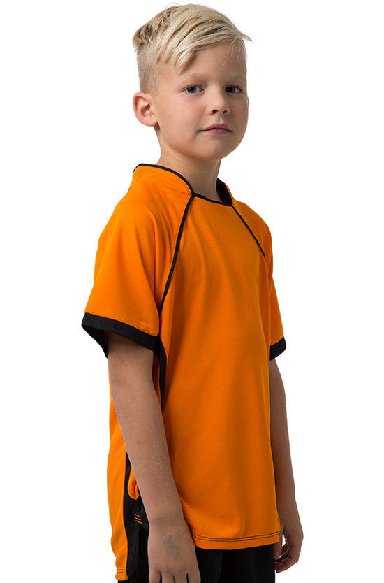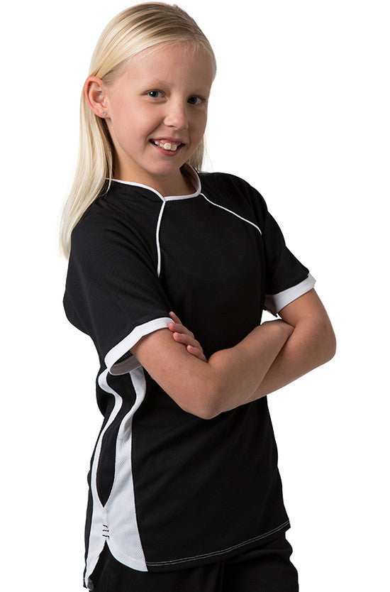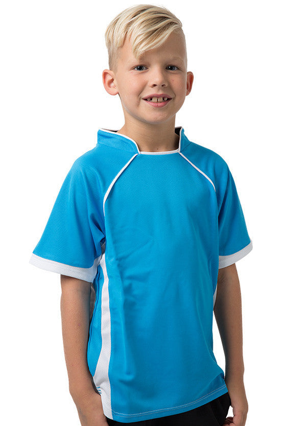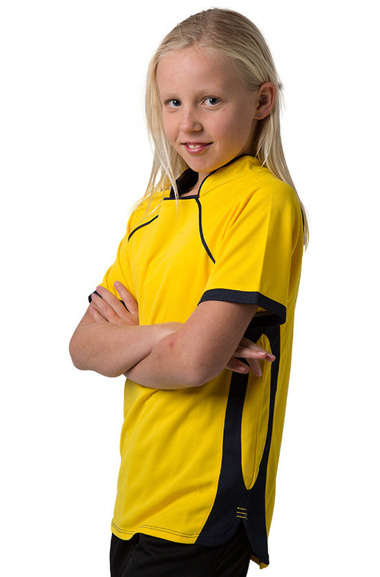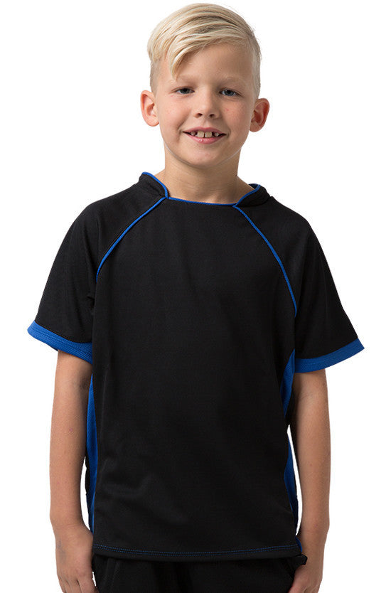 Kids 100% Polyester Cooldry pique knit body and micromesh panels moisture management t-shirt with contrast side and sleeve panels.