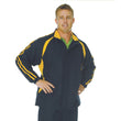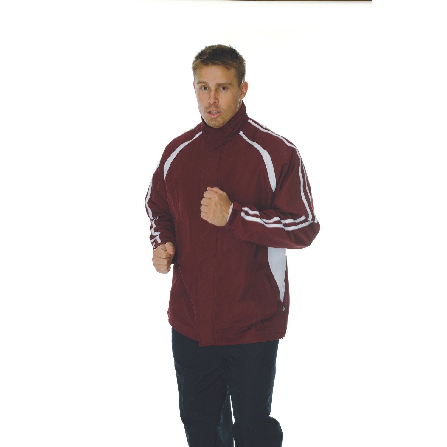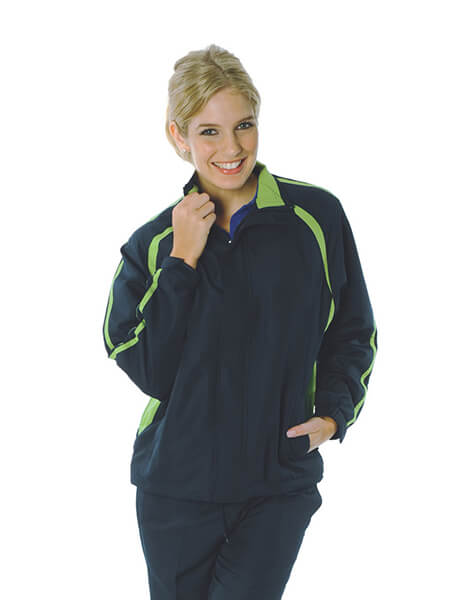 Stylish contrast stripes and panel, 2 side pockets and front zip closure with velcro. Adjustable velcro sleeves. Embroidery access.