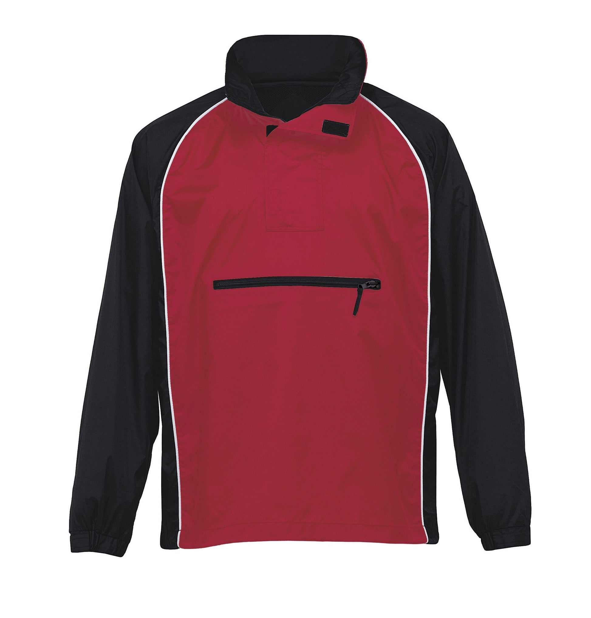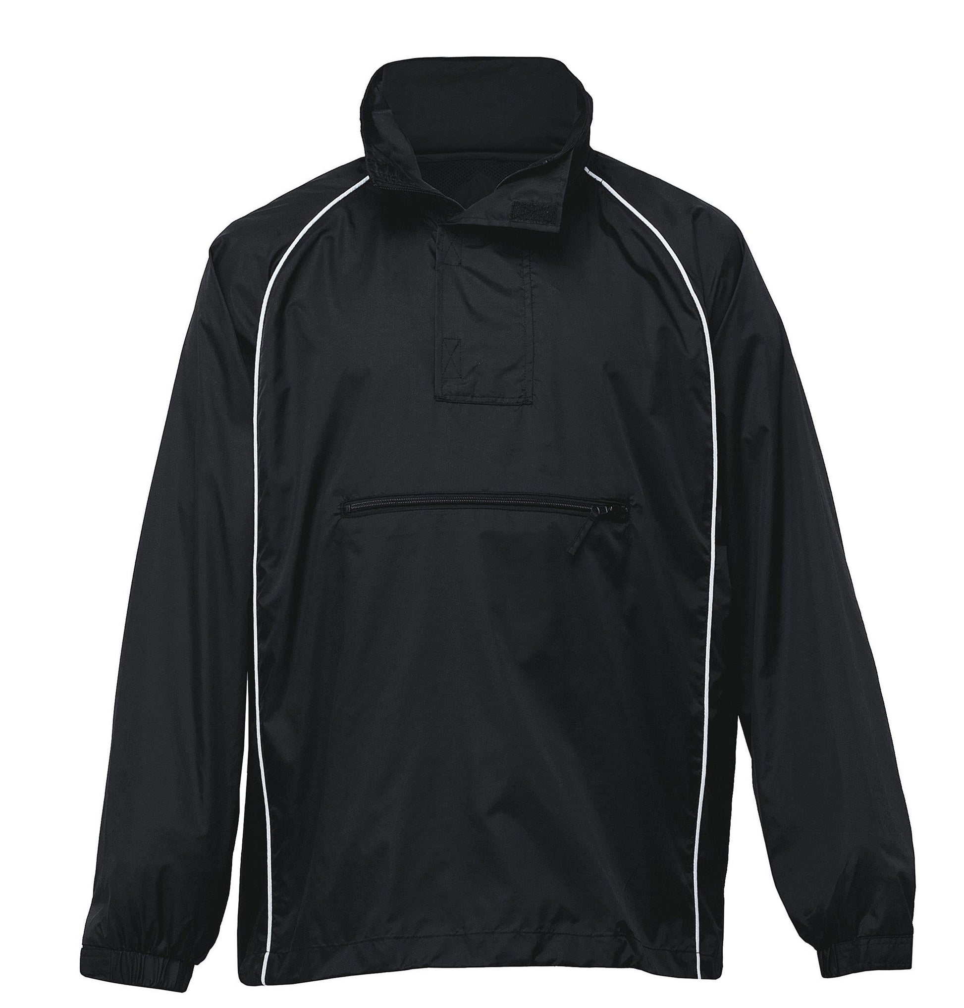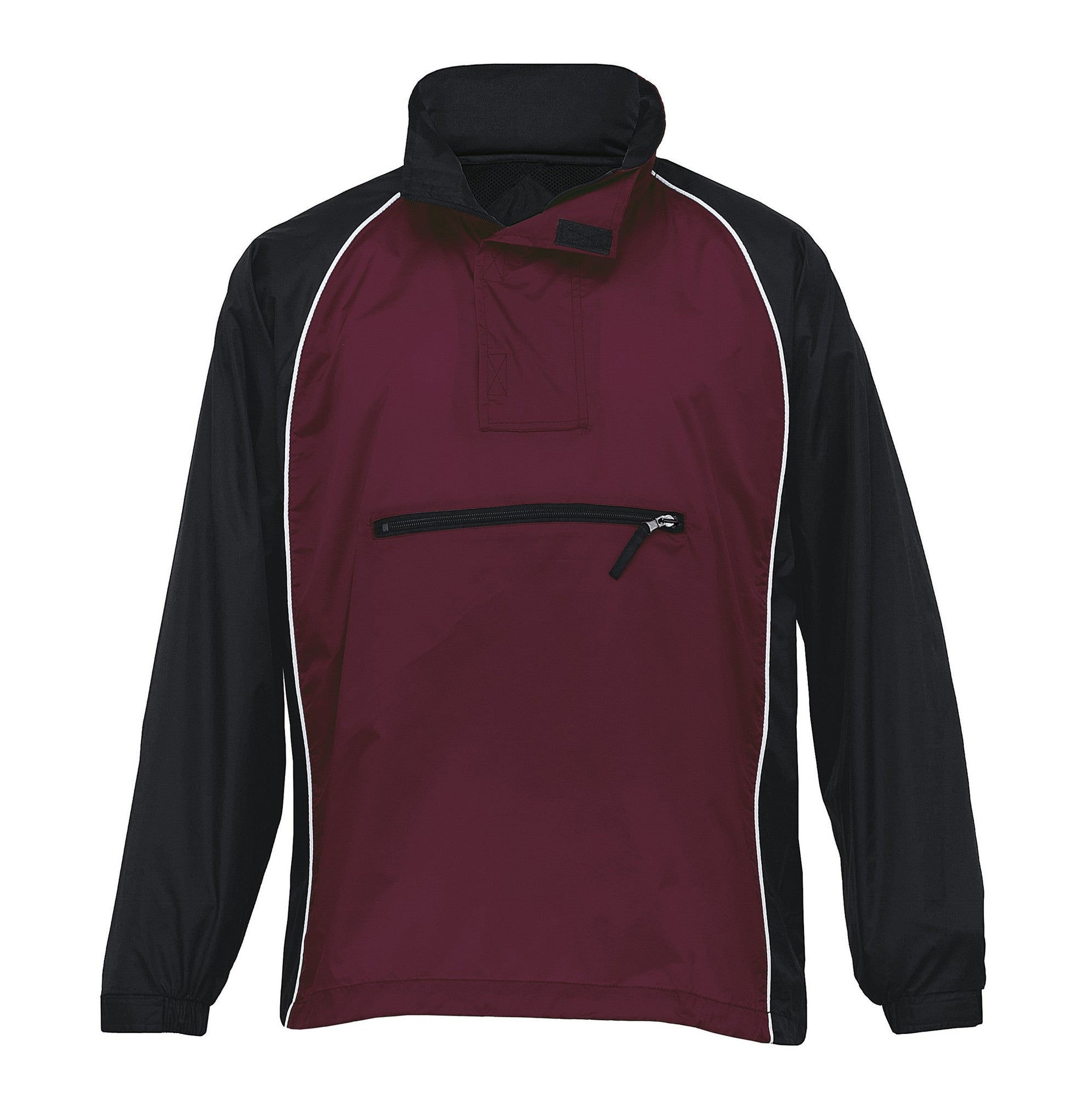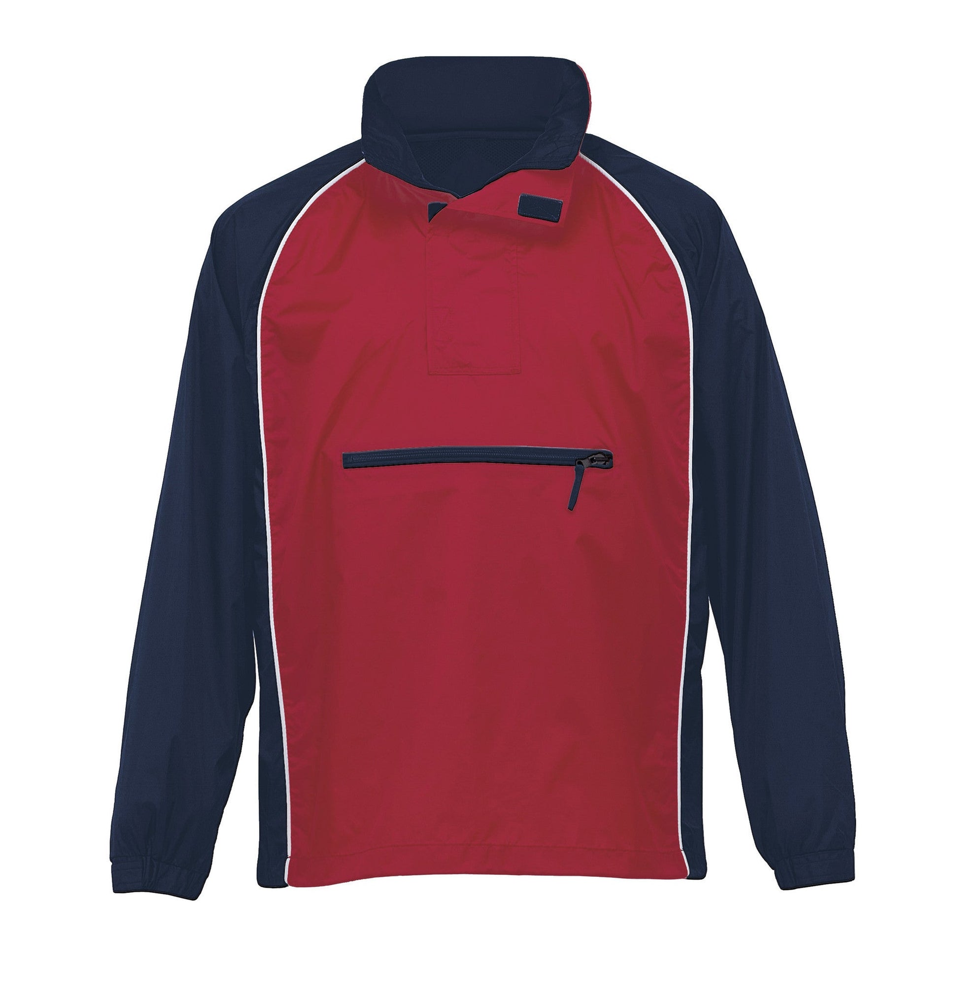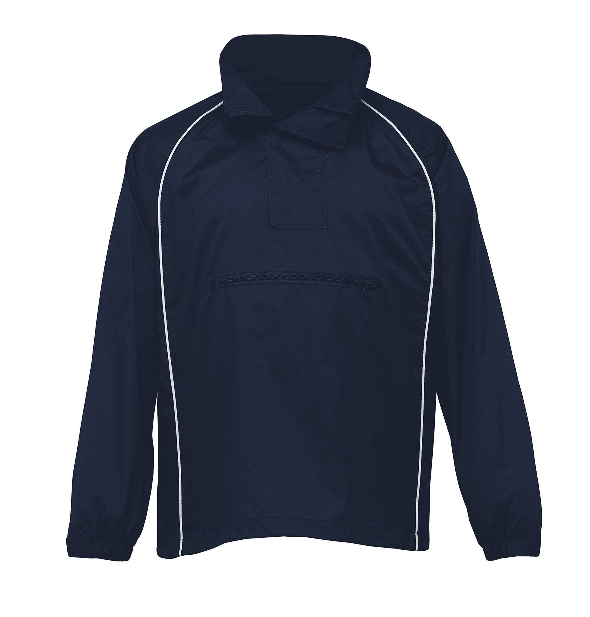 100% nylon taffeta , Showerproof , Classic fit , Jacket folds away into zippered pouch pocket , Contrast high-zip collar , Front zip plaquet with Velcro storm flap , White piping , Raglan sleeve with adjustable elasticated cuffs , Hidden tuck away hood , Elastic draw cord on hem , ½ lined with polyester meAdult Jacketssh on back , Edge stitched detailing , Branding access through shaped flap Velcro-fastened opening across back.