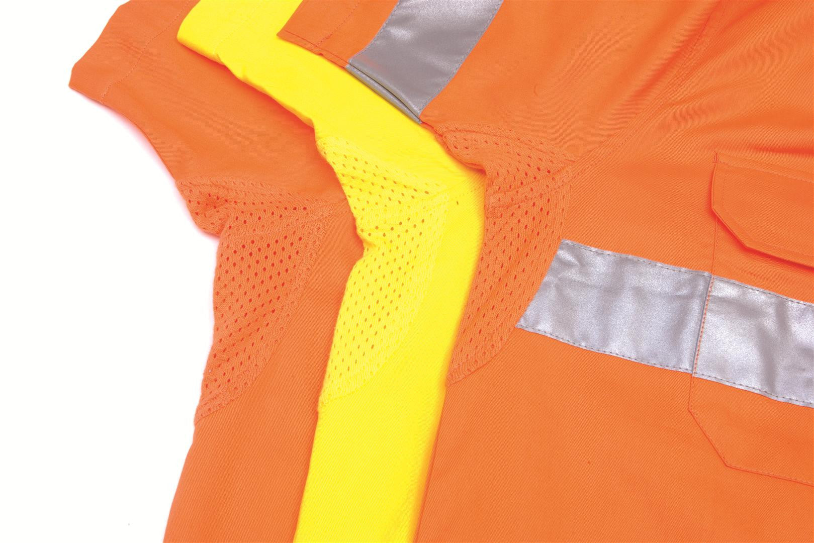 155gsm lightweight cotton with under arm cotton mesh vents. Twin button down flap pocket and sleeve pen pocket. Hoop style 3M 8910 reflective tape.