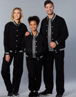 Description: Heavy ribbed collar, cuffs & waist band with contrast strips. Two front welt pockets. Press studs front closure.