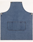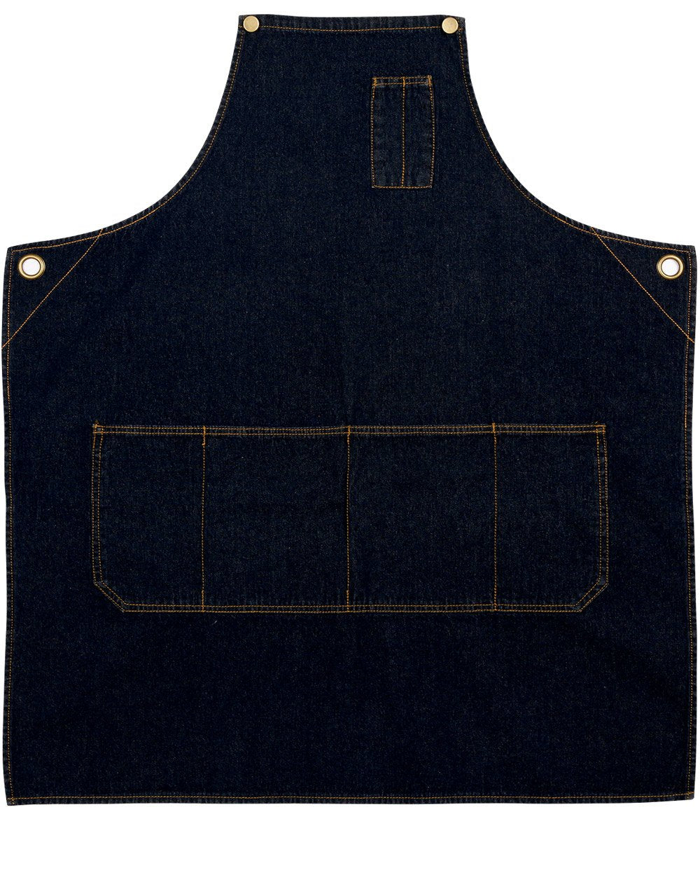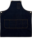 Style: Cross back Denim Bib Apron with antique brass eyelets and studs,contrast denim stitching. Apron includes 4 front pockets and 2 top pen pockets.